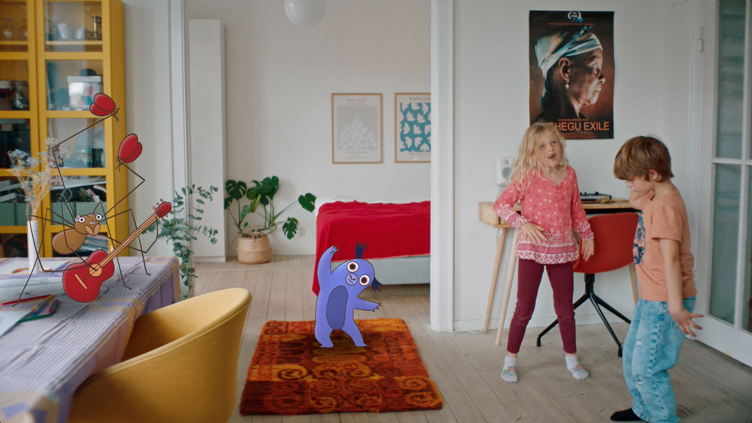Mejeredderkoppen spiller musik og Vimse leger stopdans med børnene